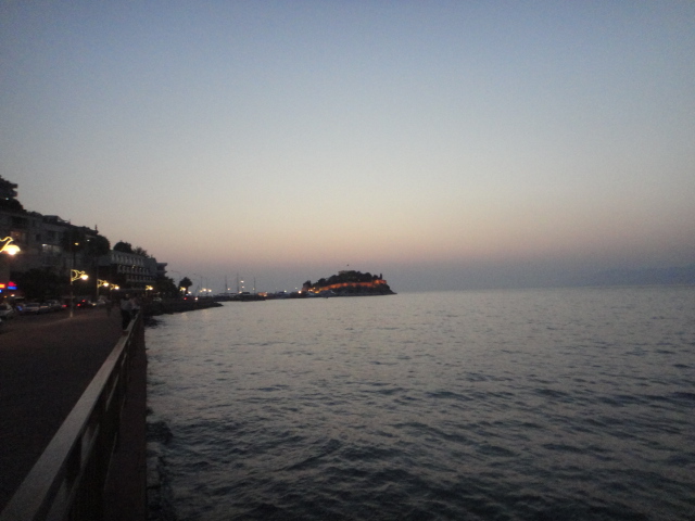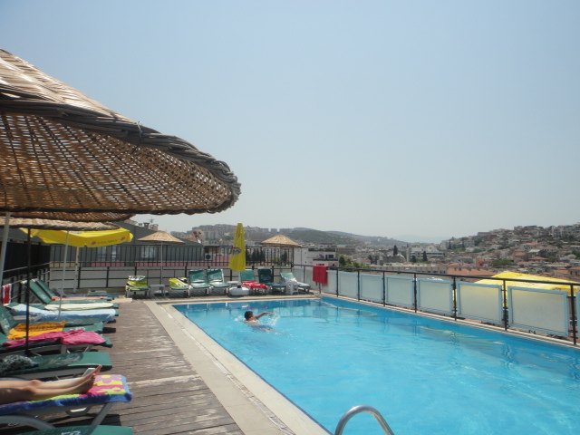 O café era simples mas autêntico e o atendimento e a localização fizeram jus ao preço de 40 euros a diária. Se não fosse por um dos atendentes do hotel teria sido bem mais chatinho fazer o traslado para o aeorporto de Izmir e ir até Pamukkale e Éfeso desempacotados e sem alugar um carro. Outro diferencial era a localização. Muito boa quando comparado ao outro, que apesar de estar próximo do centro histórico, estava em uma ladeira cercado de casas em estado de demolição por todos os lados. Essa é a fotinho da sacada do hotel em um fim de tarde!